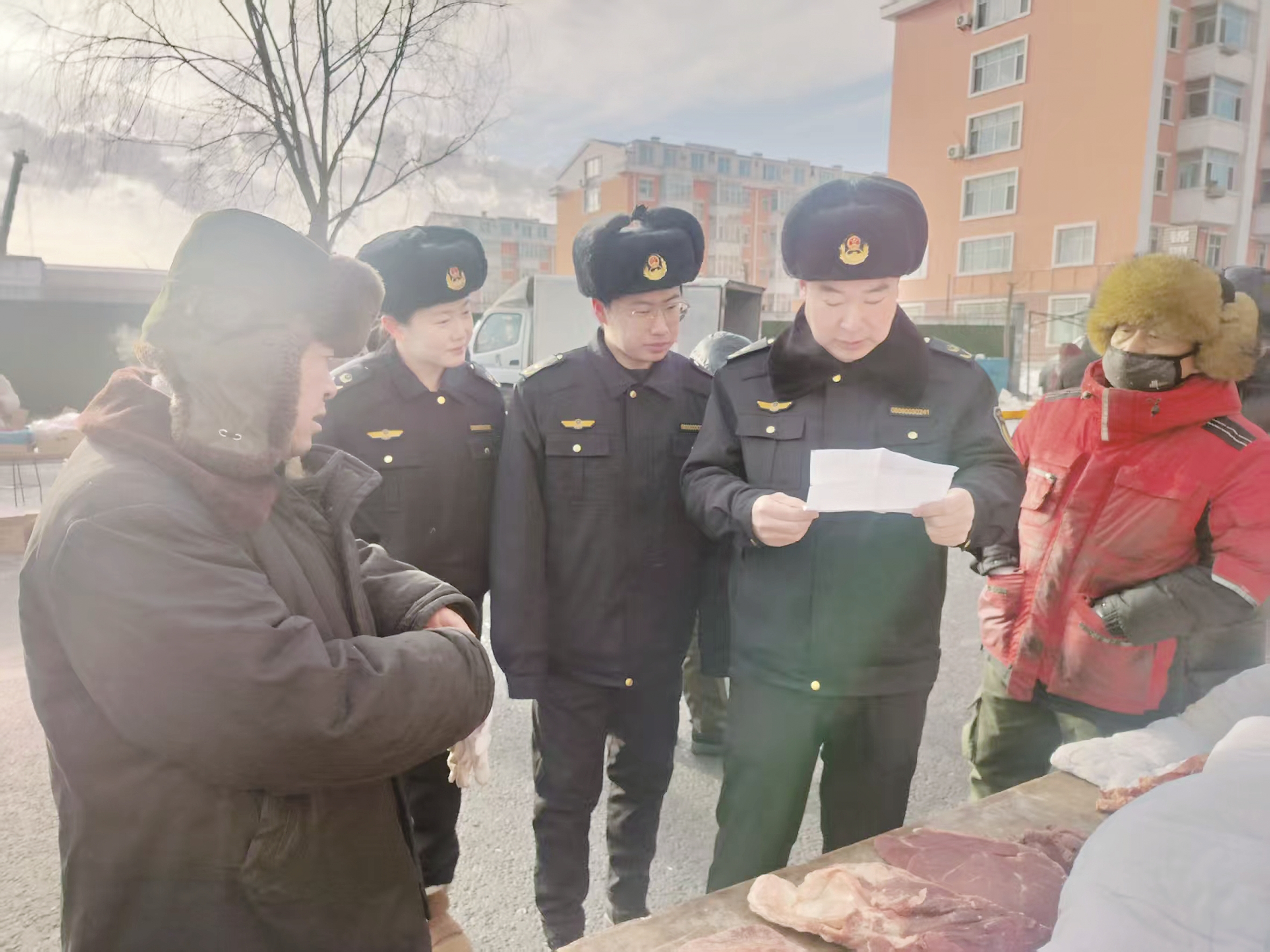 图为执法人员检查肉铺索证索票本报讯 (记者张天华)为筑牢节日食品安全防线,1月24日,市市场监督管理局茄子河分局联合湖东大集管理处,开展春节前大集食品安全专项检查,以..