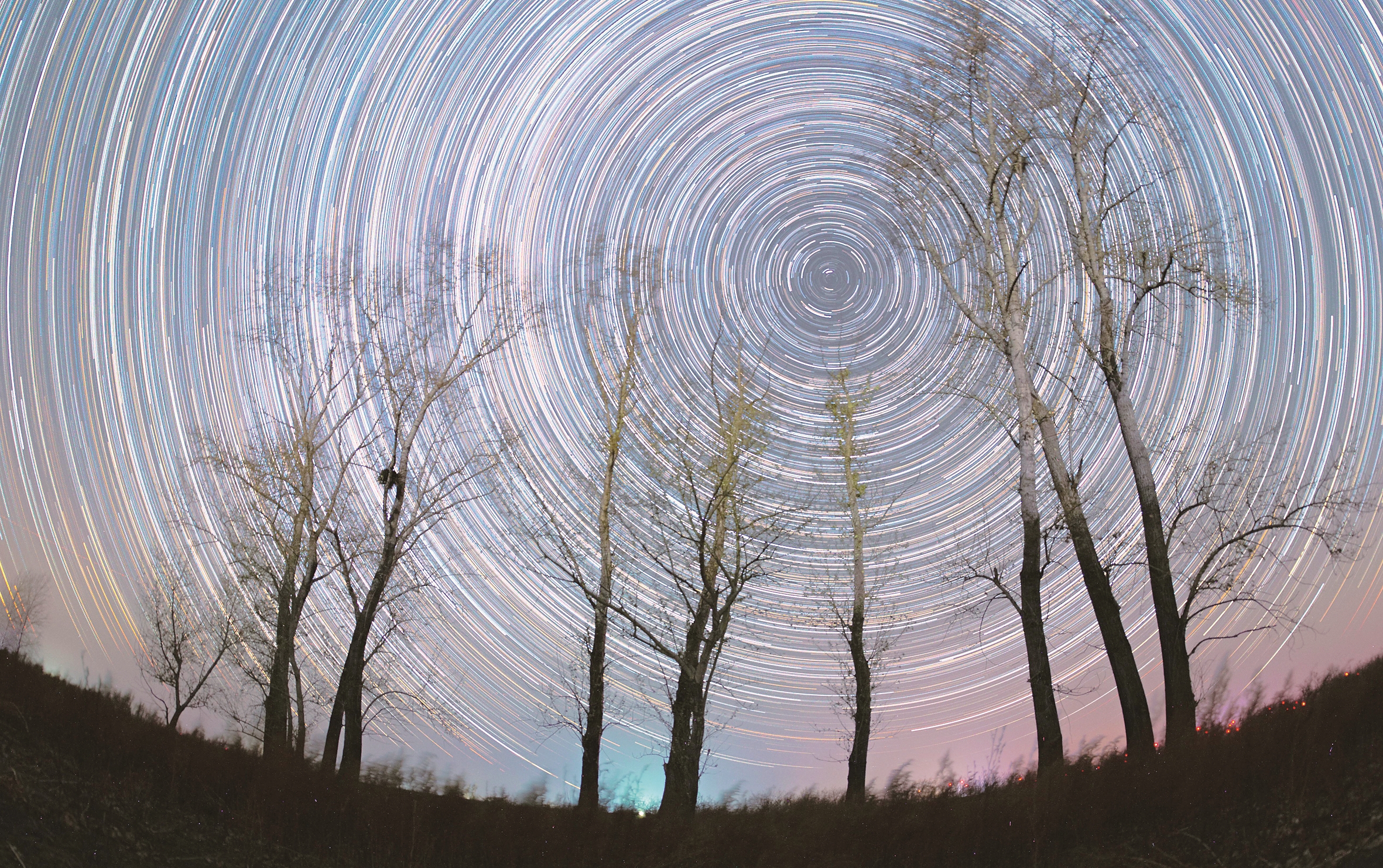 10月31日在黑龙江省富锦市拍摄的秋日星空下的秋树(堆栈合成照片)。 新华社发(庚喜庆摄)