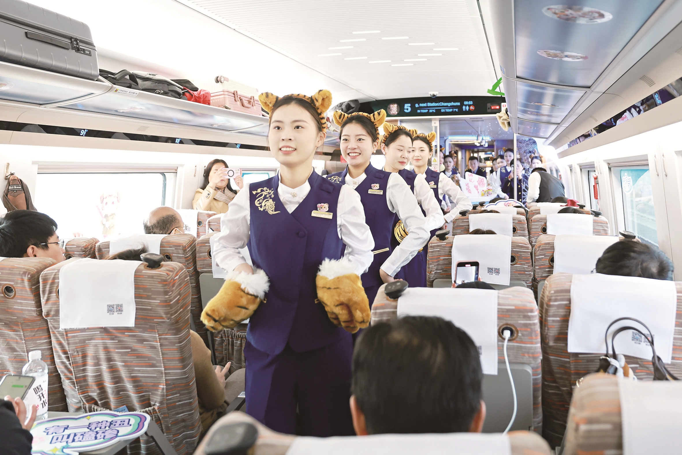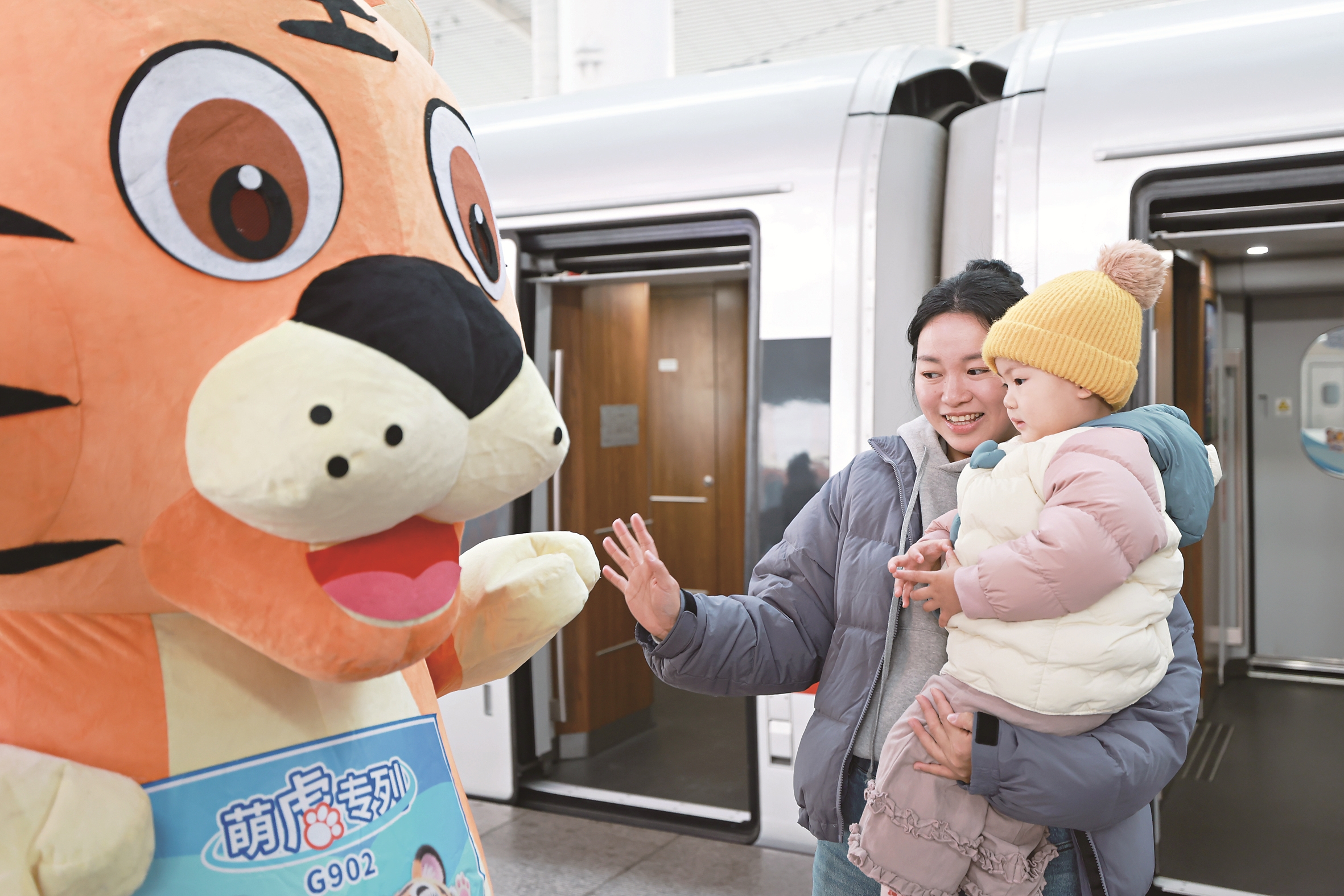 11月5日,中国铁路哈尔滨局集团有限公司哈尔滨客运段担当的G902次首趟“萌虎”主题列车从哈尔滨西站驶出,开往北京。列车以“龙江冰雪蓝”为基调,融合东北虎元素装饰车厢,让旅客在旅途中感受龙江冰雪文化的独特魅力。