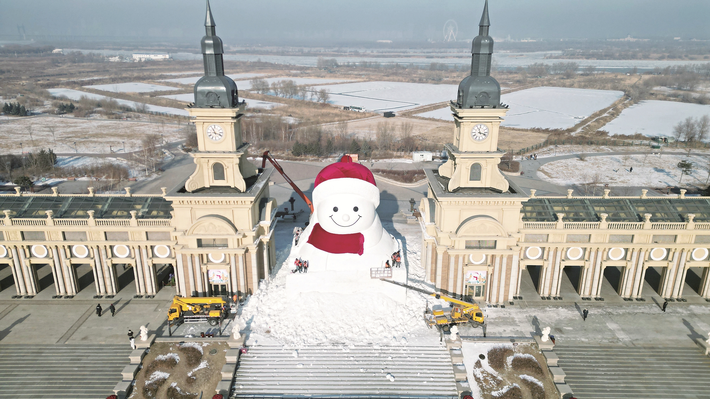 12月14日拍摄的建设中的哈尔滨市群力音乐公园网红大雪人(无人机照片)。