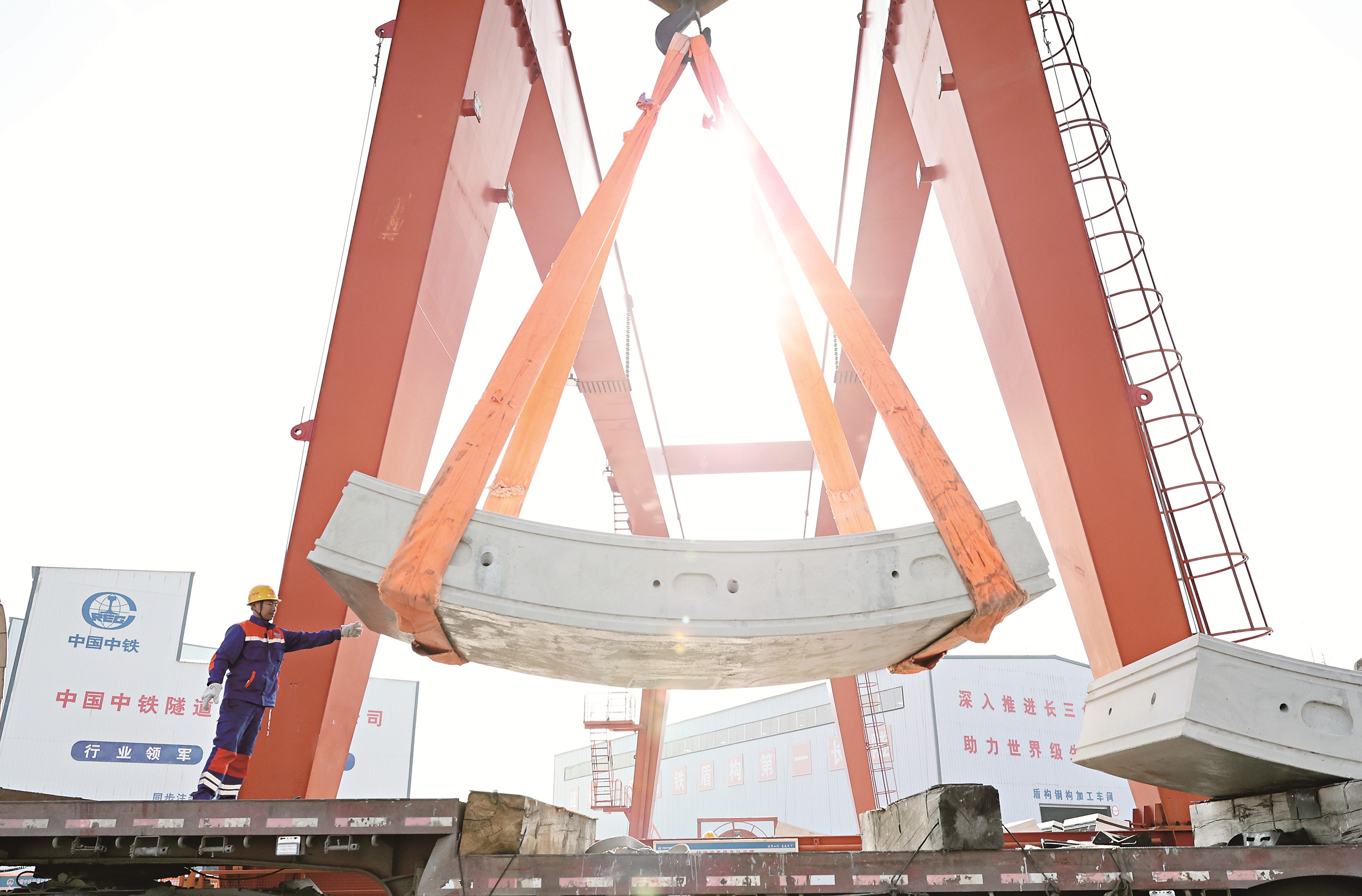 12月16日,工人在崇太长江隧道项目施工现场辅助吊车吊装隧道管片。
