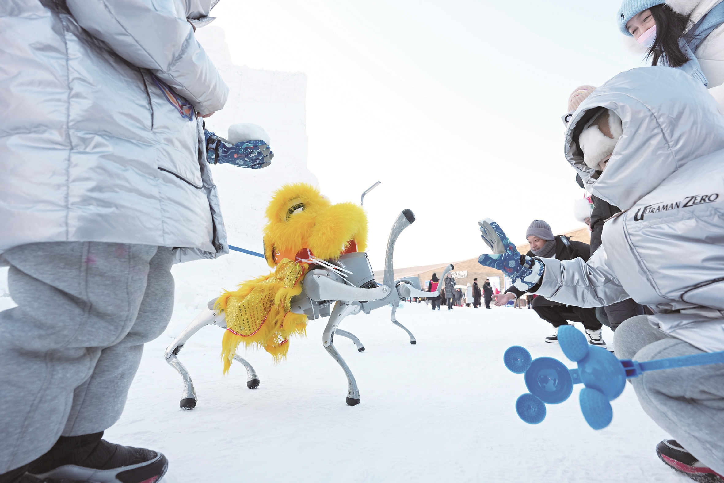 12月17日,游客在哈尔滨冰雪大世界园区内与机器狗互动。 新华社记者王松 摄