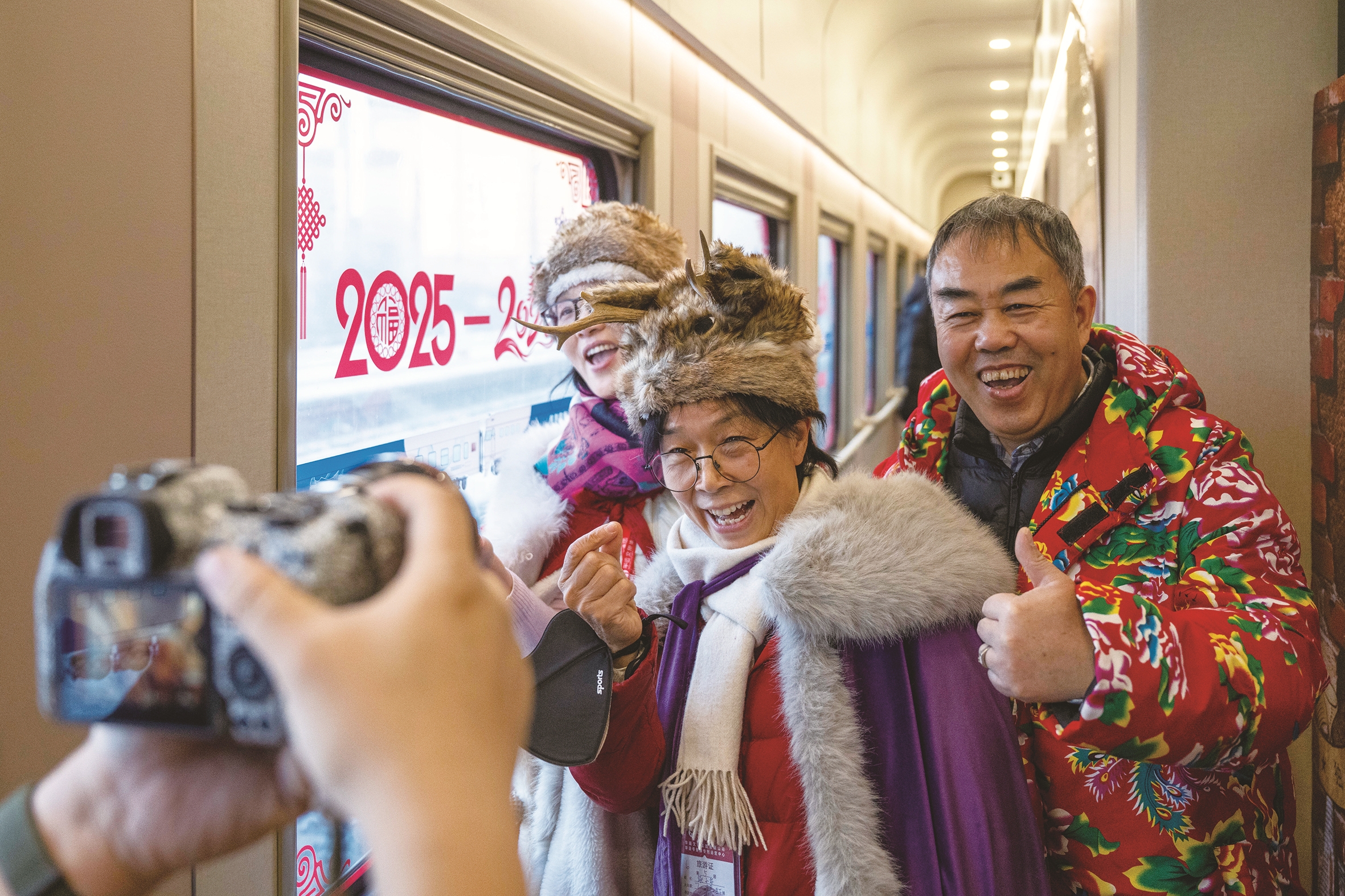 1月25日,旅客在Y783次“悠享龙江·银旅号”列车上拍照。 新华社记者张涛 摄