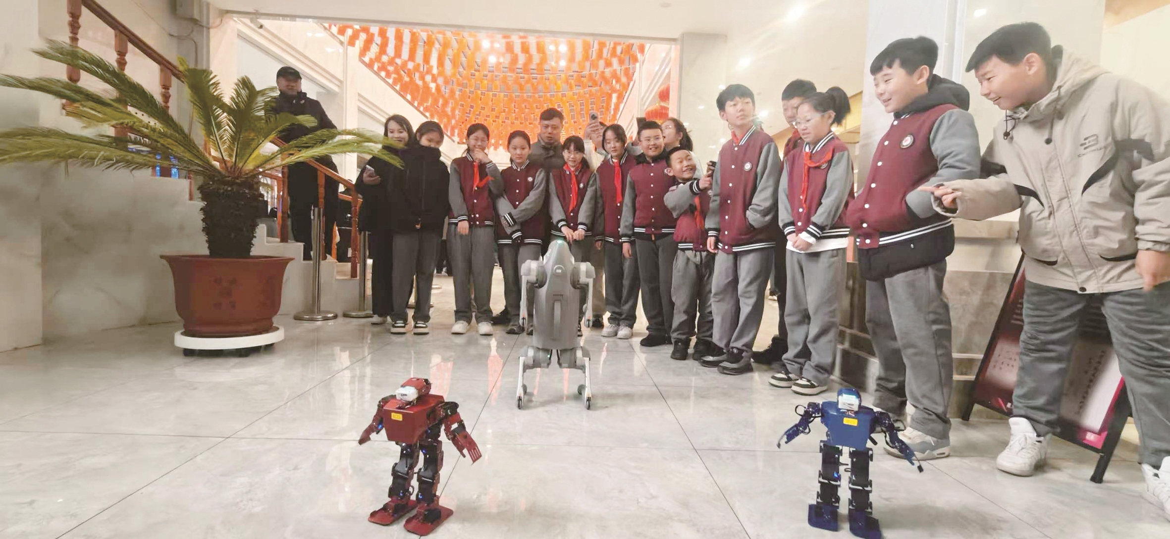 科普展品、机器人机器狗展演吸引学生驻足观看。