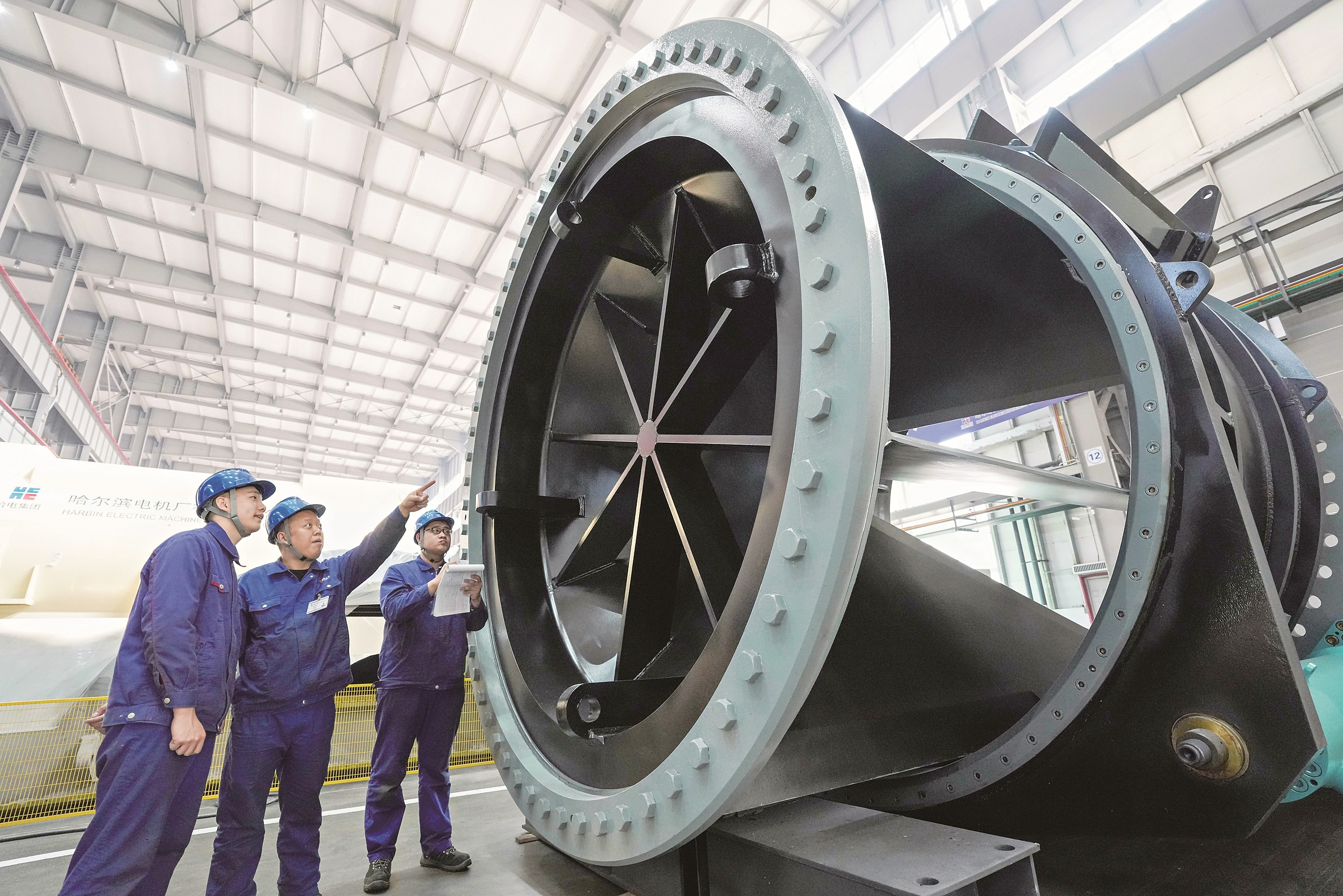 这是3月31日在哈电集团哈尔滨电机厂有限责任公司拍摄的该公司自主研制的巨型水电泄压阀。