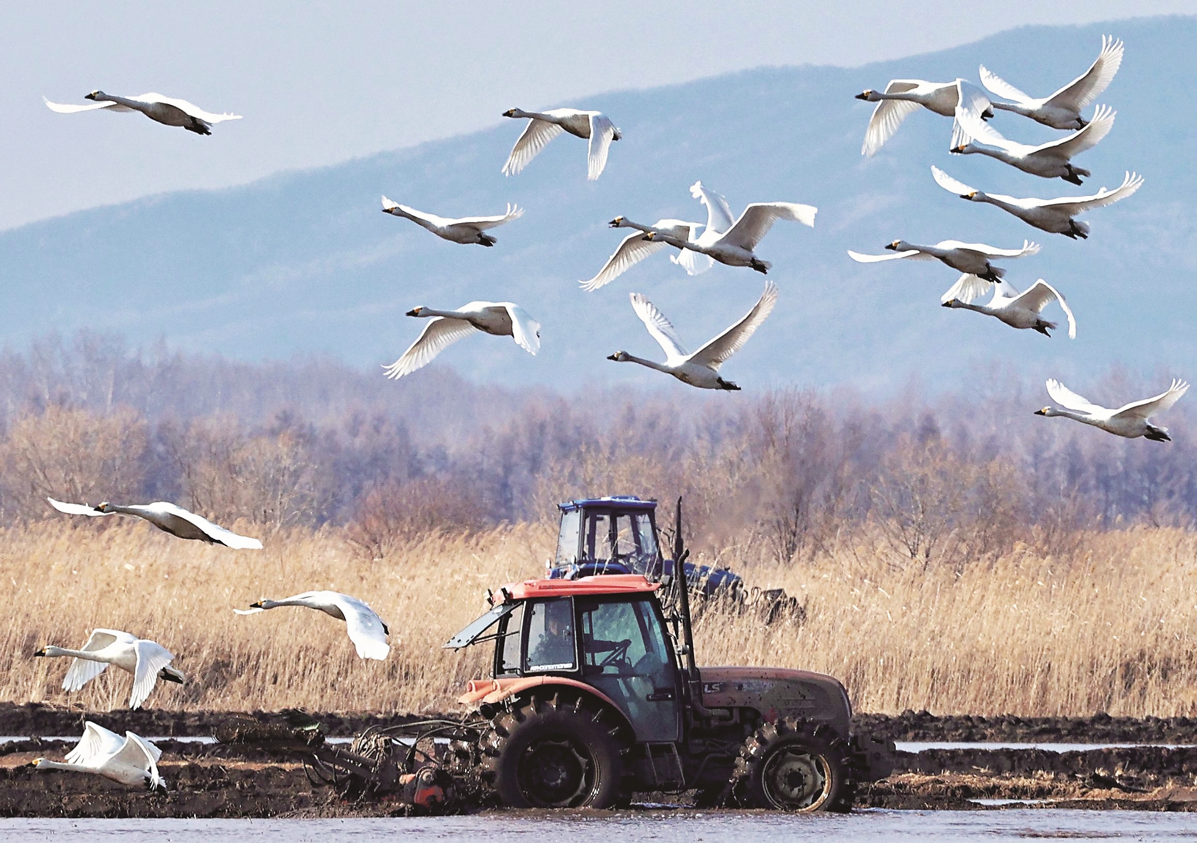 4月18日,在黑龙江省同江市的一处水田里,正在作业的农机和飞翔的天鹅相映成趣。