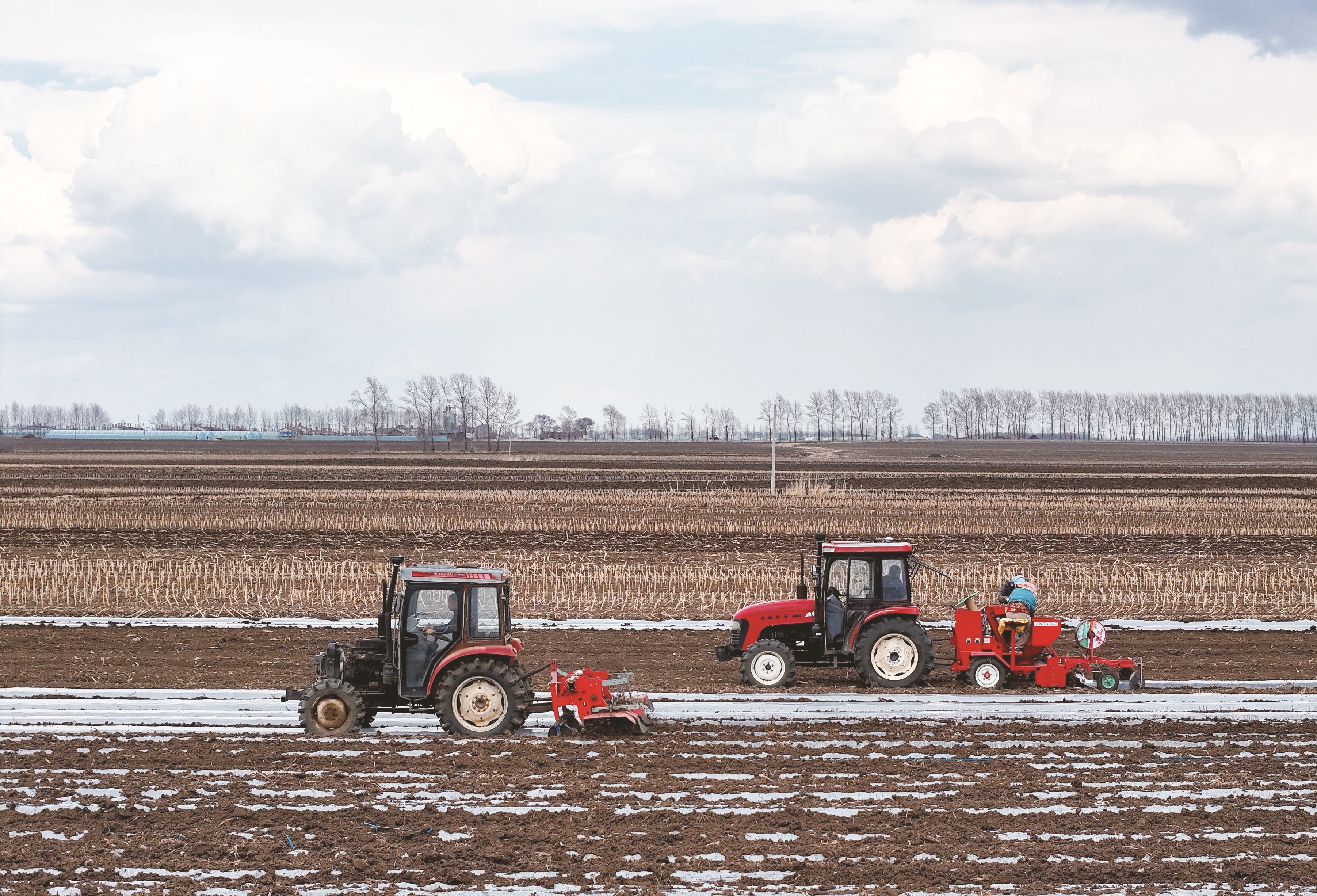 4月26日,黑龙江省富锦市上街基镇农民驾驶农机进行马铃薯覆膜播种作业(无人机照片)。