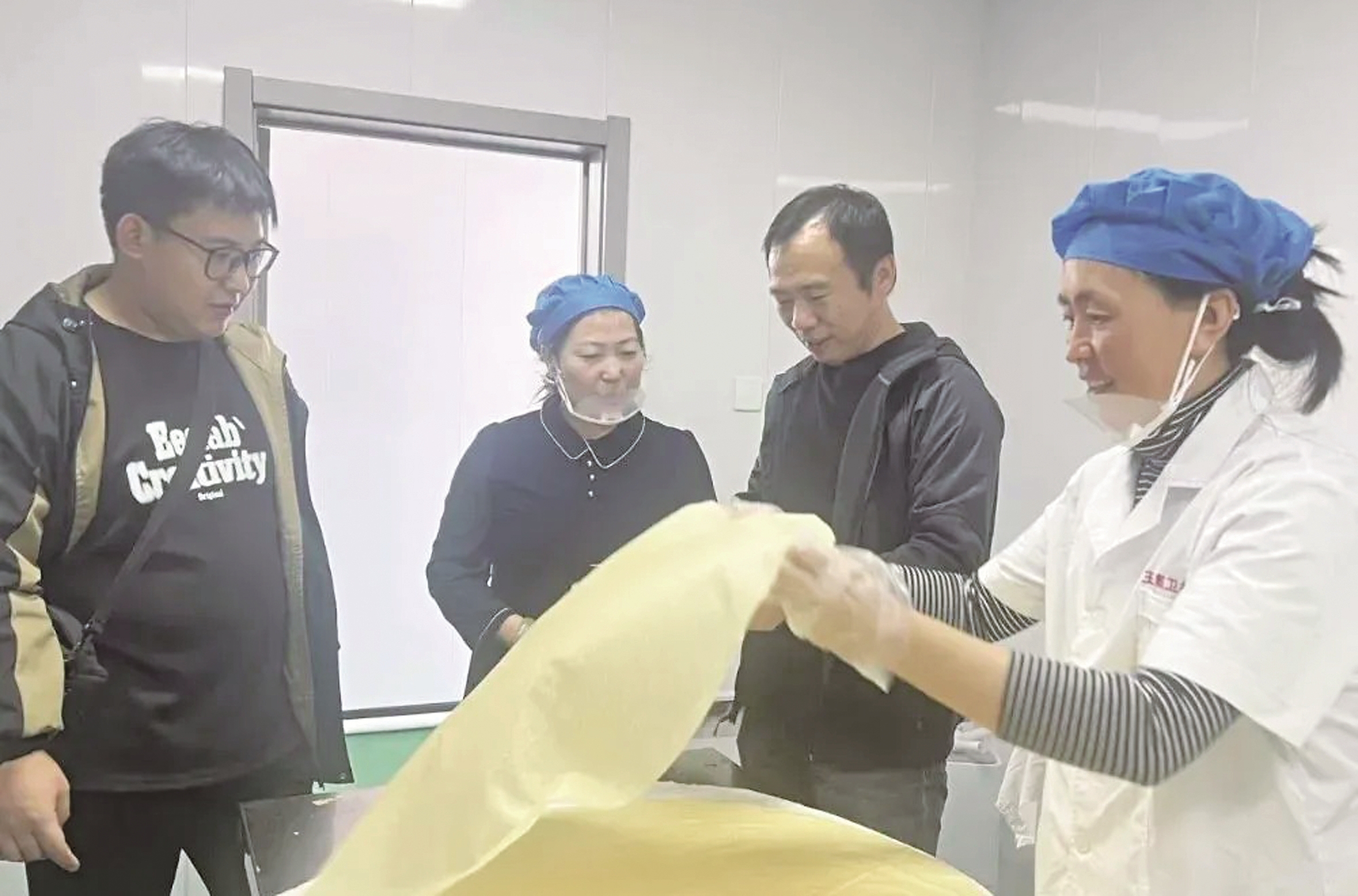 谷香来食品有限公司工作人员向客户展示薄软香糯的煎饼