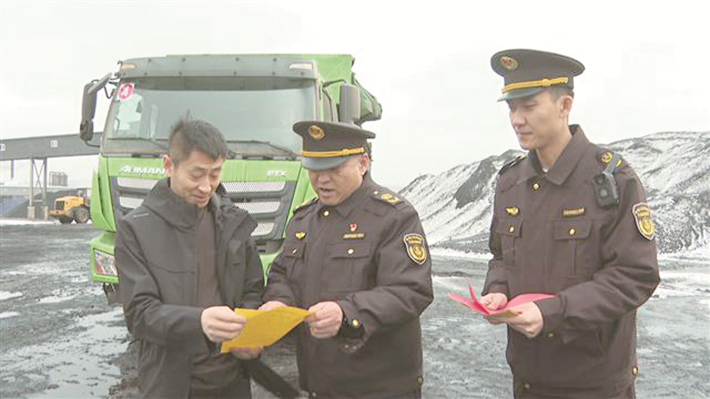 执法人员向货车驾驶员发放宣传单。