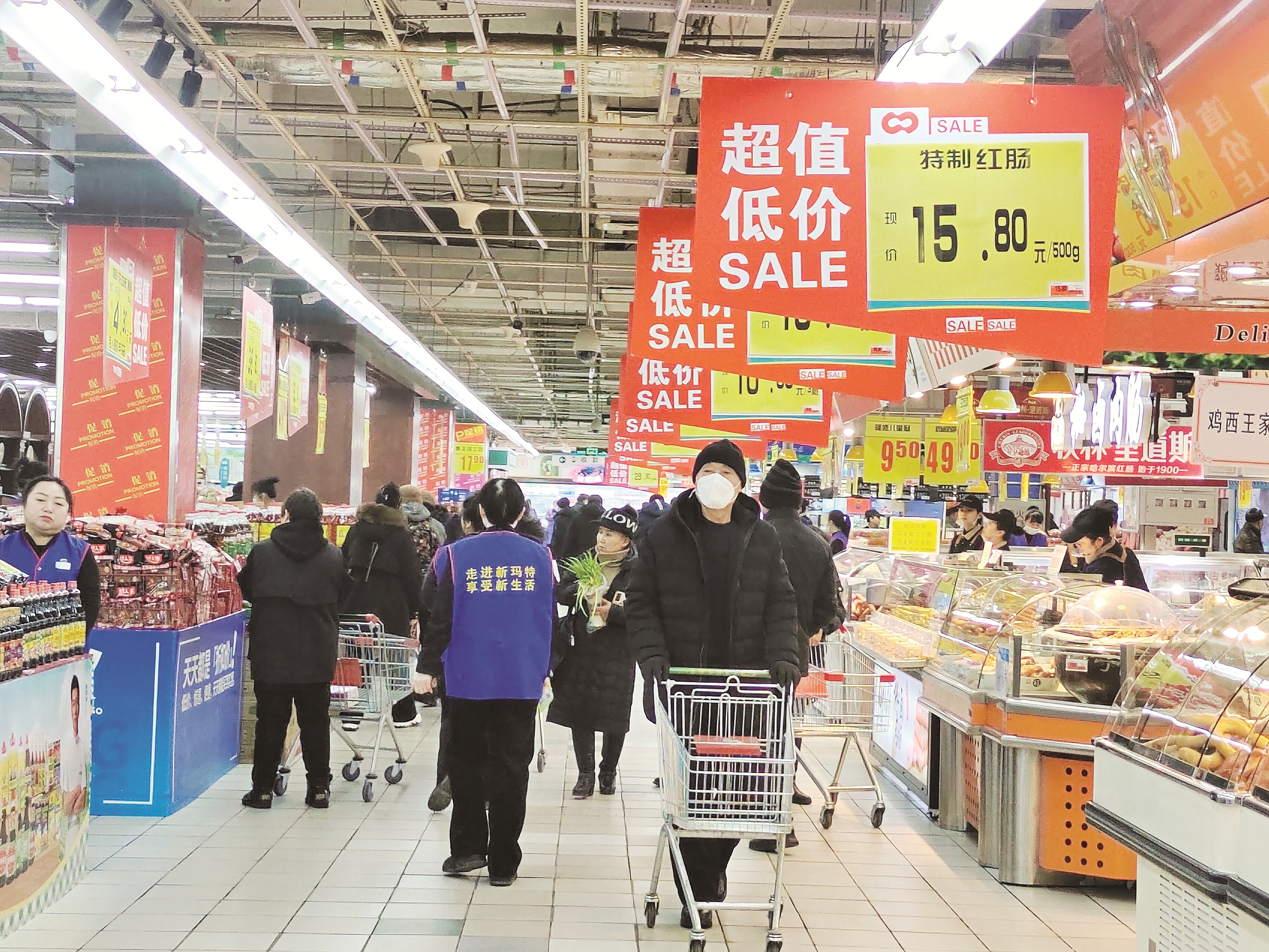 为满足市民采购需求,超市针对蔬菜、水果等民生商品推出打折优惠活动,让实惠直达百姓。大商新玛特购物广场客服部经理王丽说:“我们提前一个月组织货源,扩大储货量,丰富供给品种,同时推出了各种特价商品,让老百姓开开心心过元旦。”