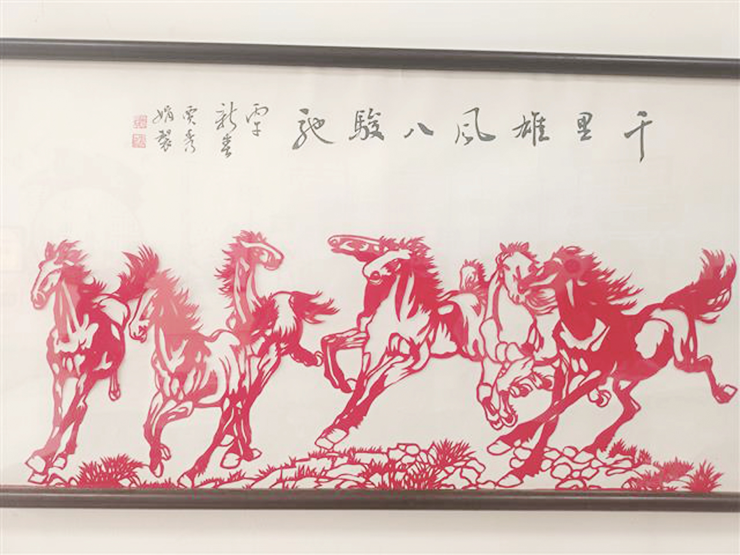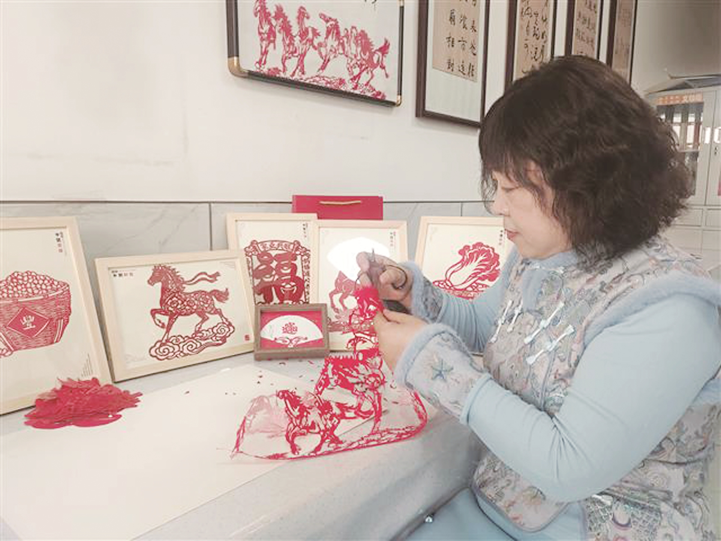 “今年我主要围绕马元素创作新年剪纸作品,大概有20多种,最满意的就是这幅八骏图。”贾秀娟介绍,这幅作品的创作颇具难度,从整体构思到细节刻画都花费了不少心思,“要展现出八匹骏马奔跑时的气势,画面里骏马脚下的草坪、路上的小石子,都要剪得细致入微,这幅作品整整用了三天才完成。”
