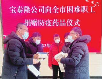 爱心企业向市总工会捐赠防疫药品和物资本报讯 (记者刘爽)日前,宝泰隆新材料股份有限公司向市总工会捐赠防疫药品和物资,市总工会把防疫药品和物资第一时间发放给全市困难..